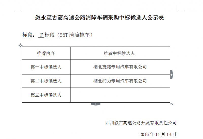 敘永至古藺高速公路清障車輛(F標段)采購中標候選人公示表
