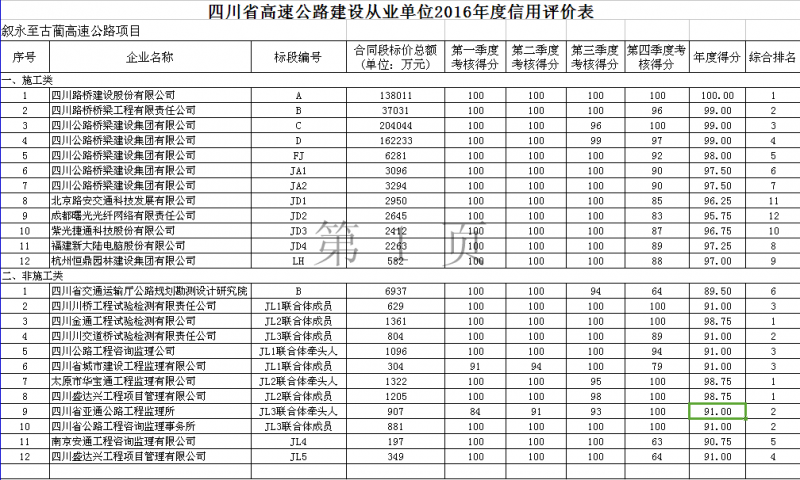 敘永至古藺高速公路從業單位2016年信用評價公示表