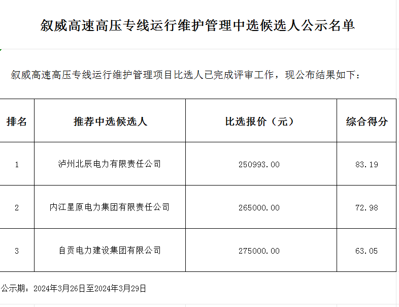敘威高速高壓專線運(yùn)行維護(hù)管理中選候選人公示名單
