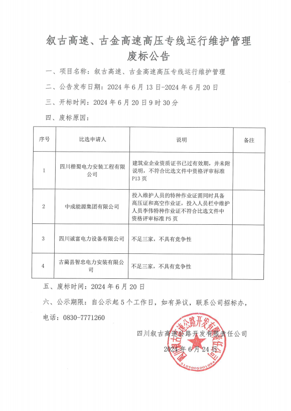 敘古高速、古金高速高壓專線運行維護管理廢標公告