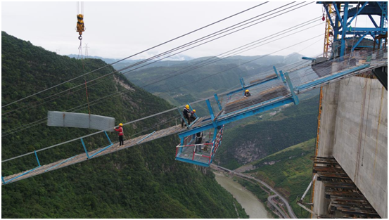 貓道,是懸索橋施工過程中獨有的作業平臺,根據施工設計要求,在四川岸和貴州岸主塔之間分別架設一根主纜,以主纜為中心,向下1.5米的地方各設置一條寬度為4米的貓道。貓道系統由承重、扶手索、門架、橫向通道等十余個部分組成,其主跨長1200米,兩岸邊跨共530米,總長1780米,左右幅貓道間距為27米,每隔一段距離建一條連接道。“貓道”施工分為單線往復式牽引系統、托架及托架承重繩、貓道承重繩、變位下壓架等關鍵節點。其中,最驚心動魄的當屬“貓道”橫向通道架設和面網鋪裝,在距離谷底四百多米的高空上,峽谷內的高空風力在6級上下,普通人連站在塔頂都會感到手腳發軟頭暈目眩,而經驗豐富的作業工人們身上系著安全帶,腳踩一根根直徑僅54毫米的鋼繩,用扳手鉚緊“貓道”面網的扶手繩、安裝兩跨“貓道”之間的橫梁門架,從兩岸塔頂往中跨小心翼翼地進行面網的鋪裝,大有昔日紅軍四渡赤水、飛奪瀘定橋的英勇豪邁氣概。已經搭建好的“貓道”面層由粗細鋼絲網、防滑木條、門架橫梁及鐵絲防護網等組成,橫向通道及“貓道”面層是在橋塔兩側的工作平臺組拼,“貓道”面采用預制成拼裝網片單元分段鋪設。作為主纜架設和鋼桁吊裝施工的重要施工便道,建設者們將借助它來進一步完成主纜索股牽引、吊索安裝、鋼桁梁吊裝、主纜纏絲防護等施工步驟。